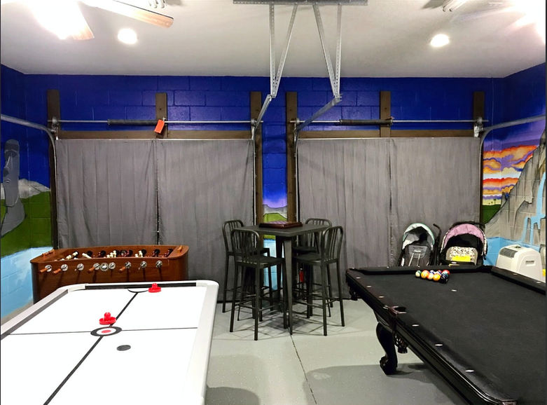 Fully equipped game room, including an air hockey table, foosball, and x box gaming system